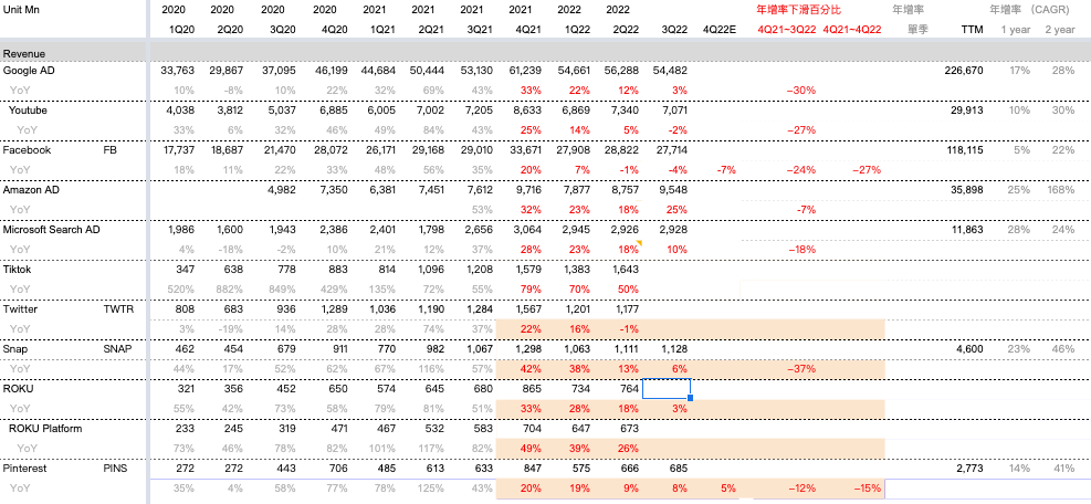 從2021Q4-2022Q1來看,Facebook營收年增率從20%下滑至-4%(排除匯率影響年增2%),同時期其他同業如SNAP營收增長從42%掉到6%;Google從33%掉到3%,顯示出當整體廣告需求下滑時,廣告預算會更集中在Google, Facebook等大型廣告公司