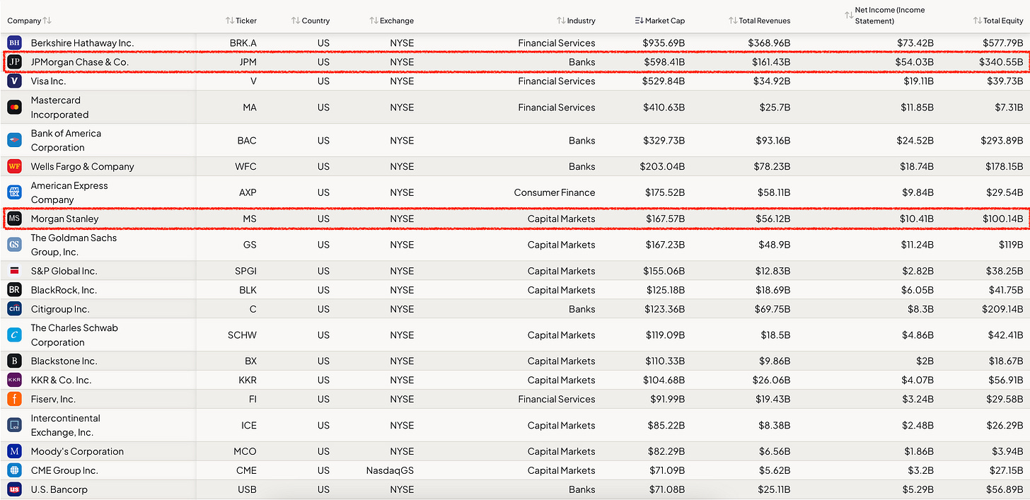 目前J.P. Morgam與Morgan Stanley 市值加起來大概7,659億美元,是美國第二大金融機構,僅次於以保險為主的Berkshire,遠遠超過其他同行。他的出身一開始就不平凡,中間經歷了轉型才到今天。