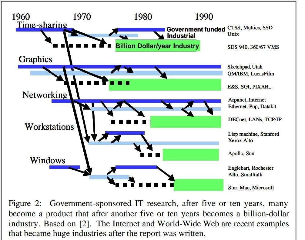 政府資助的 IT 研究,在五到十年後,許多研究成果會轉化為產品,再過五到十年則成為價值十億美元的產業。基於 [2]。Internet 和 World-Wide Web 是最近的例子,它們在報告撰寫後成為巨大的產業。